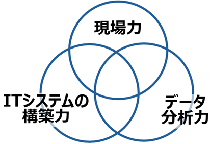 1つ目は、各企業・各部署における専門的なビジネス知、いわゆる現場力である。汎用的な専門スキルもあれば、企業分野や部署に特化した暗黙知や経験則的なものもある。2つ目は、ITインフラを構築していくIT力である。現代におけるビジネスオペレーションのほとんどはITインフラに依存しており、ビジネス構築に不可欠なスキルとなっている。3つ目は、戦略立案やマーケティング、効果検証、オペレーション効率化などを推進するために必要となるデータ分析力である。