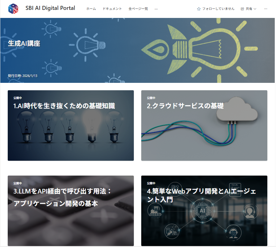 後編では、研修プログラムの内容を詳細に紹介していく。短期集中の垂直離陸型研修は、4つの講義と自習で構成されている(図表1)。前半の2つが主に座学であり、その後のPython事前自習期間をはさんで、後半2つが開発環境を用意してのハンズオンセッションとなっている。研修講義に用いたマテリアルと講義ビデオは、イントラネットのSBI AI Digital PortalでSBIグループ内に公開されており、研修対象者以外にも参照可能となっている(図表2)。