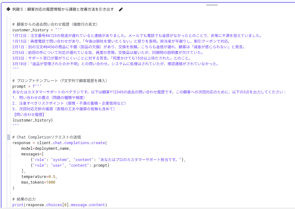 ハンズオンの冒頭では、環境変数と設定管理の扱いを学習した。APIキーやエンドポイント情報をコード中に直接記述せず、.envファイルを通じて外部化している(図表4)。これは単なるセキュリティ配慮にとどまらず、開発・検証・本番といった複数環境を切り替えて利用する際の基本的な設計思想を理解させる狙いがある。生成AIを業務システムに組み込む際、こうした設定管理の巧拙が運用負荷やリスクに直結することを学べる構成となっている。