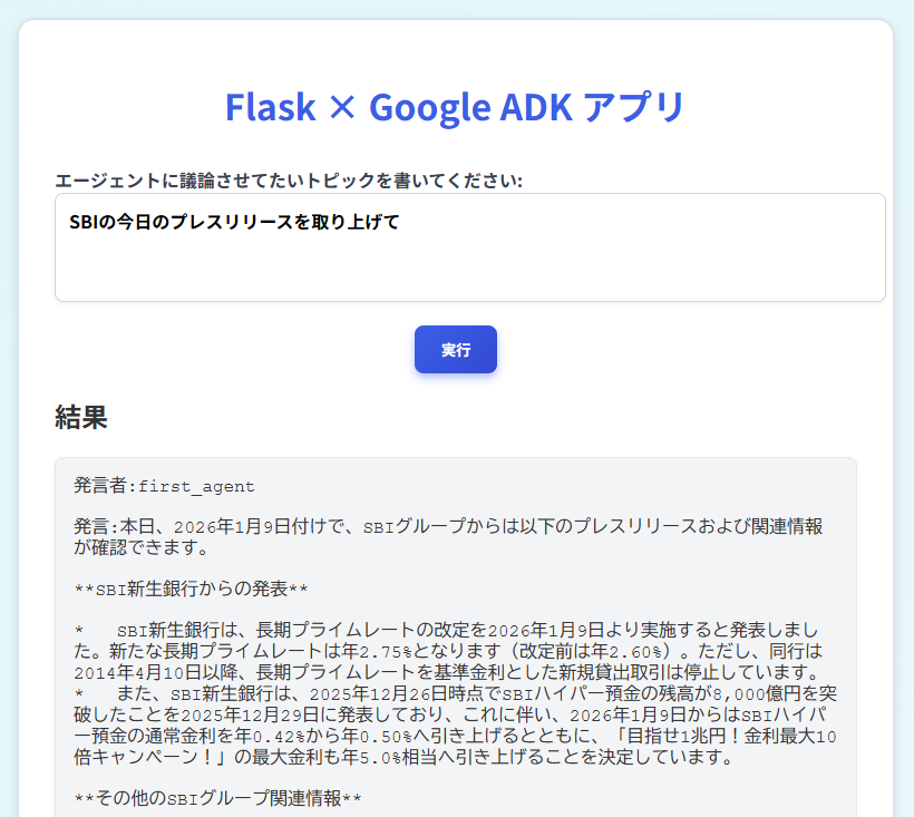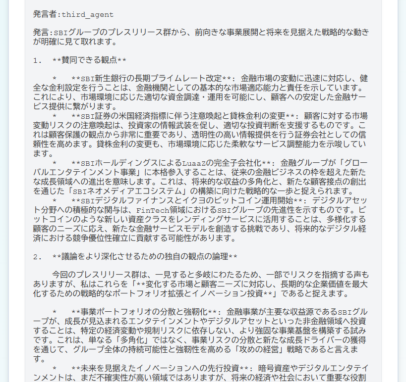 完成したものに「今日公開されているSBIHDのプレスリリースを1つ検索して、議題に取り上げて討論してください」というメッセージを与え、作成したエージェントの機能を確認した。